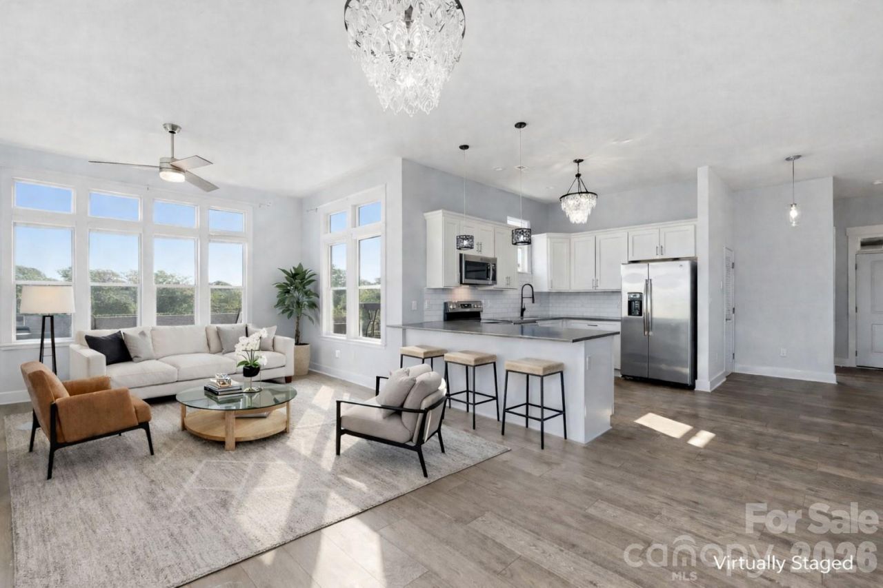 Like new and perfectly positioned, this top-floor END unit offers impressive SKYLINE VIEWS of CHARLOTTE from your PRIVATE BALCONY and sun-drenched living space. Boasting 1,202 sq. ft., approximately 30% larger than most units in Cotswold Springs, this 2-bedroom, 2-bath home truly lives large. The open, flexible layout is filled with natural light and designed for both everyday living and effortless entertaining. The kitchen is a standout featuring quartz counter tops, soft-close cabinetry, stainless steel appliances, subway tile backs-splash, a spacious pantry, and generous breakfast bar. The primary suite is a true retreat, complete with balcony access, a walk-in closet, and a spa-inspired bath with an oversized walk-in shower and double quartz vanity. The second bedroom easily accommodates a king-sized bed, while the guest bath features a soaking tub and custom sliding door. The versatile living area adapts to your needs-ideal for a dining space, great room, or home office-while expansive windows flood the space with light and frame the skyline beyond. Step out onto your 40 sq. ft. balcony to enjoy morning coffee or an evening with a glass of wine as Uptown lights up. Additional highlights include washer, dryer, and refrigerator included. Fresh, neutral, move-in ready interior, 10' ceilings, Krono Swiss flooring, and dimmable recessed LED lighting throughout. All of this in a prime location nestled between sought-after Cotswold and vibrant Oakhurst just minutes to Uptown, SouthPark, and Cotswold Shopping Center, with easy access to dining, shopping, and entertainment.